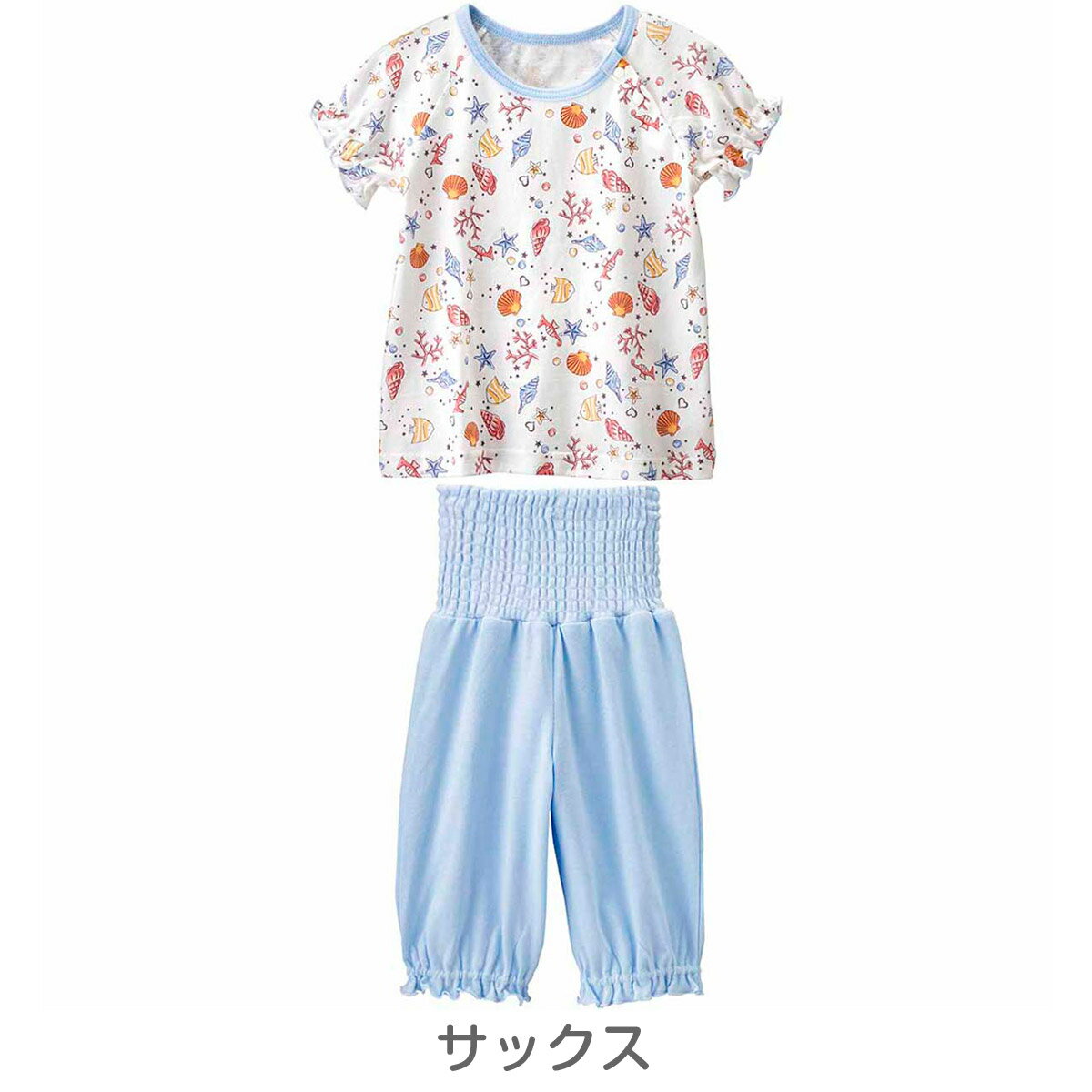 サイズについてCombimini(コンビミニ)のびのび腹巻付き半袖パジャマ(シェル) シェルや熱帯魚、サンゴ礁などをモチーフにした、涼しげなガールズパジャマ。